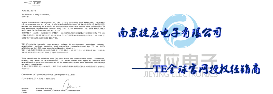 南京捷應(yīng)電子有限公司是國(guó)際無(wú)源器件品牌美國(guó)泰科電子(TE)在中國(guó)華東地區(qū)的主要通路商,代理經(jīng)銷(xiāo)旗下全系列產(chǎn)品包括TYCO(AMP)系列連接器、接插件、OEG、SCHRACK、P&B功率繼電器、美國(guó)RACHEM各類航空導(dǎo)線、熱縮套管、模縮套、標(biāo)識(shí)產(chǎn)品、電線電纜。